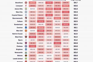 阿斯頓維拉、曼城以及水晶宮三支球隊(duì)并列第三,對手平均評分均為93.3。其中,曼城的賽程尤為引人注目,他們將連續(xù)客場挑戰(zhàn)布倫特福德和維拉,并在最后一場比賽中主場迎戰(zhàn)利物浦。