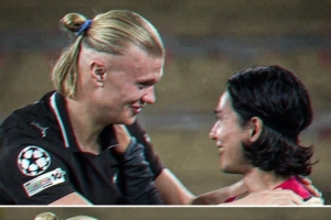 哈蘭德與南野拓實擁抱寒暄,此役哈蘭德為曼城打進(jìn)2球,而效力于摩納哥的南野拓實擔(dān)任替補(bǔ)未能出場。