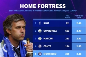 體育資訊10月3日訊 根據(jù)德轉(zhuǎn)統(tǒng)計(jì),在英超執(zhí)教單一俱樂部各項(xiàng)賽事主場(chǎng)場(chǎng)均得分榜上,斯洛特位列第一,瓜迪奧拉第二,穆里尼奧第五,弗格森第六。