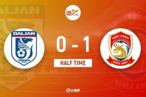 傷停補(bǔ)時(shí)4分鐘。上半場(chǎng)比賽結(jié)束,大連英博0-1青島西海岸。
