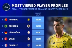 體育資訊10月5日訊 德國(guó)轉(zhuǎn)會(huì)市場(chǎng)列出了9月份球員頁(yè)面瀏覽量排名,C羅居首,埃德森、京多安二三位,梅西排名第7位。