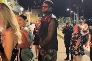 喬治在夜店門(mén)口排隊(duì),還戴著護(hù)膝。身前站著的是他的妻子Daniela