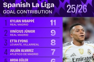 體育資訊10月7日訊 日前,Squawka統(tǒng)計(jì)了本賽季西甲參與進(jìn)球次數(shù)排行,姆巴佩參與11球居首。
