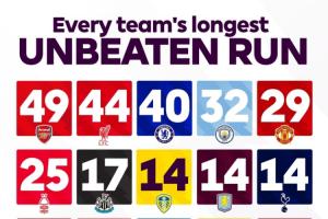 英超官方盤點了聯(lián)賽中每支球隊目前的最長不敗紀錄,并發(fā)問:“你覺得阿森納的紀錄會有被打破的那一天嗎?”