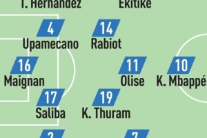隊(duì)報(bào)預(yù)測(cè)法國隊(duì)首發(fā):邁尼昂;特奧、于帕梅卡諾、薩利巴、古斯托;拉比奧特、K-圖拉姆、?;倏恕W利塞、科曼;姆巴佩