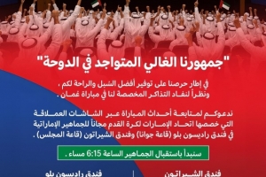 我們邀請(qǐng)您在阿聯(lián)酋足球協(xié)會(huì)為阿聯(lián)酋球迷免費(fèi)提供的位于麗笙酒店(喬安娜廳)和喜來登酒店(馬吉利斯廳)的巨型屏幕上關(guān)注比賽動(dòng)態(tài)。我們將于18:15(22:15)開始接待公眾。”