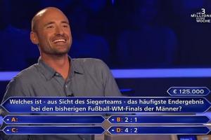 體育資訊10月11日訊 在德國版的《誰想成為百萬富翁》智力競賽節(jié)目中,一位參賽者沒能回答對世界杯決賽的比分,錯失12.5萬歐元(約103萬人民幣)獎金。