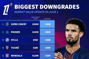 體育資訊10月12日訊 德國轉(zhuǎn)會(huì)市場更新了法甲球員的身價(jià),并列出身價(jià)下跌排名,扎伊爾-埃梅里、帕瓦爾、西拉-500萬歐居首。