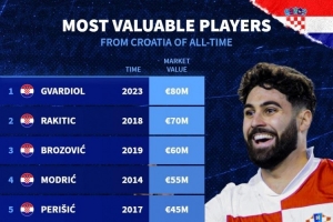 體育資訊10月13日訊 德國轉(zhuǎn)會市場統(tǒng)計(jì)了克羅地亞球員的歷史最高身價,并列出克羅地亞球員歷史身價排名,格瓦迪奧爾8000萬歐居首。