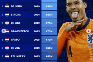 以下為荷蘭球員歷史身價(jià)榜top10: