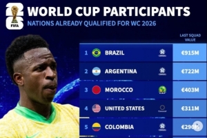 體育資訊10月14日訊 德轉(zhuǎn)列出已經(jīng)鎖定2026年世界杯參賽資格的球隊(duì)的身價(jià)排行榜,巴西、阿根廷前二,佛得角第20位。