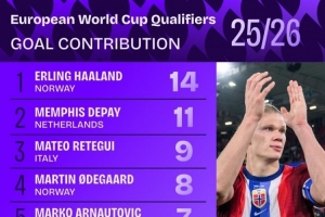 本屆歐洲世預(yù)賽參與進(jìn)球榜:哈蘭德14球居首,德佩11球次席