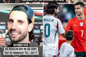 比賽結(jié)束后,索博斯洛伊接受采訪(fǎng),被問(wèn)及C羅有沒(méi)有遵守諾言把球衣給他,索博斯洛伊開(kāi)心地回答道:“是的,我拿到了!”