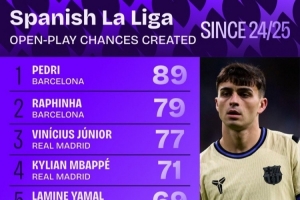 體育資訊10月16日訊 日前,Squawka統(tǒng)計(jì)了西甲運(yùn)動(dòng)戰(zhàn)創(chuàng)造機(jī)會(huì)次數(shù)排行,佩德里、拉菲尼亞前二,維尼修斯第三。