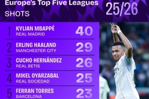 體育資訊10月17日訊 Squawka統(tǒng)計了本賽季到目前為止歐洲五大聯(lián)賽球員射門次數(shù)排行,皇馬前鋒姆巴佩40次射門排名第一,哈蘭德29次第二。