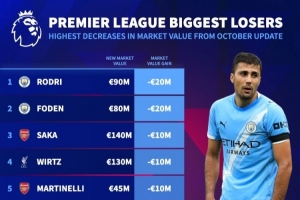 體育資訊10月17日訊 德轉(zhuǎn)統(tǒng)計(jì)了最新的英超球員身價(jià)跌幅榜單,曼城中場(chǎng)羅德里和福登身價(jià)均下降2000萬(wàn)歐元,分列前二,阿森納四人上榜。