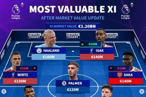 體育資訊10月18日訊 德轉(zhuǎn)在本月17日更新英超球員身價,同時列出英超球員身價最貴陣,哈蘭德、維爾茨、伊薩克在列,總身價達(dá)12億歐。