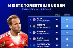 體育資訊10月20日訊 《轉(zhuǎn)會(huì)市場(chǎng)》統(tǒng)計(jì)了本賽季五大聯(lián)賽球員在俱樂(lè)部各項(xiàng)賽事的直接參與進(jìn)球總數(shù)情況,凱恩、姆巴佩、哈蘭德分列前三。