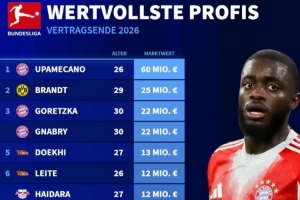 體育資訊10月23日訊 《轉(zhuǎn)會(huì)市場(chǎng)》統(tǒng)計(jì)了合同將在明夏到期的德甲球員身價(jià)情況,拜仁中衛(wèi)于帕梅卡諾獨(dú)自領(lǐng)跑。