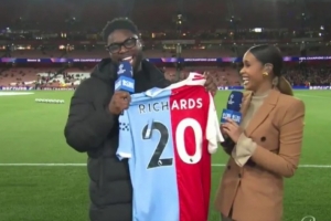 37歲的理查茲受邀現(xiàn)場評論阿森納vs馬競的歐冠比賽,當他站在鏡頭前時,轉(zhuǎn)播員送給他一份特別的禮物。