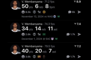 全場比賽,文班僅出場29分40秒,21投15中,三分2中1,罰球11中9,爆砍40分15籃板1助攻1搶斷3蓋帽,正負值+31。