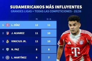體育資訊10月24日訊 德國轉(zhuǎn)會(huì)市場(chǎng)統(tǒng)計(jì)了本賽季五大聯(lián)賽南美球員的參與進(jìn)球數(shù)量,并列出榜單,路易斯-迪亞斯參與11球居首,阿爾瓦雷斯、維尼修斯參與10球次席。