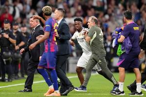 體育資訊10月27日訊 西班牙國家德比皇馬2-1擊敗巴薩,TA發(fā)文梳理本場比賽最后階段的一系列亂象,由于球員情緒失控,警察出面干預才將球員分開。