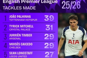 1.若昂-帕利尼亞,托特納姆熱刺,39次
