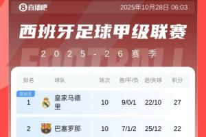 西甲10輪過(guò)后積分榜如圖: