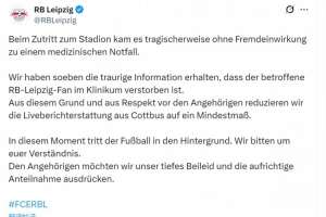 萊比錫俱樂部確認(rèn),一名萊比錫球迷進(jìn)入球場時(shí)發(fā)生緊急醫(yī)療情況(與外部因素?zé)o關(guān)),被送往醫(yī)院,最終在醫(yī)院去世,萊比錫俱樂部社媒因此將這場比賽的直播報(bào)道減少到最低限度,并向家屬表示深切慰問。