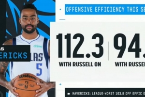 拉塞爾在場時獨行俠進(jìn)攻效率112.3,下場后為94.7;目前獨行俠進(jìn)攻效率103.8聯(lián)盟墊底