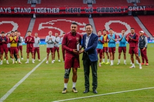 今天的官方訓(xùn)練開始前,俱樂部為兩位球員舉行頒獎(jiǎng)儀式。俱樂部總經(jīng)理沙良昌為萊昂納多頒發(fā)第25輪最佳球員獎(jiǎng)杯,為李帥贈(zèng)送百場(chǎng)紀(jì)念球衣。