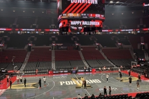 賽前,開拓者跟隊中文記者Victor Sun分享開拓者主場地板,并寫道:“NBA杯遇上萬圣節(jié)。”