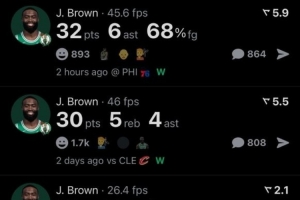 過(guò)去四場(chǎng)比賽,杰倫-布朗砍三場(chǎng)30+,其中一場(chǎng)40+,場(chǎng)均能夠轟下29.5分。