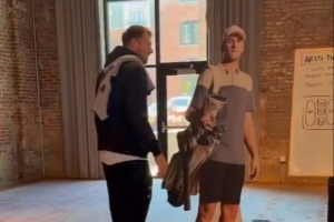 視頻當(dāng)中,東契奇將里夫斯的真人等高紙板一把推倒,隨后分別進行高爾夫推桿嘗試但均未成功,兩人也不忘互損一番。