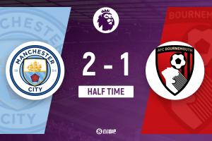 半場結(jié)束,曼城2-1伯恩茅斯。