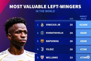 體育資訊11月3日訊 德轉(zhuǎn)列當(dāng)前世界足壇左邊鋒身價(jià)排行,維尼修斯1.5億歐居首,克瓦納茨赫利亞、拉菲尼亞9000萬歐并列第二。
