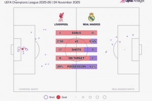 利物浦在本場比賽中將皇馬的預(yù)期進(jìn)球(xG)限制在僅0.45,幾乎沒有給對手機(jī)會。
