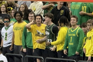 今日俄勒岡大學(xué)以67-63戰(zhàn)勝萊斯大學(xué),取得開季兩連勝,小吧來到現(xiàn)場觀戰(zhàn),看到現(xiàn)場有很多林葳的球迷,一個外國人還穿著同曦球衣。