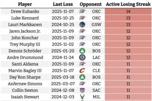現(xiàn)役球員面對(duì)一支球隊(duì)的連敗榜,尤班克斯對(duì)雷霆14連敗第一,威少對(duì)森林狼10連敗,5天后雙方再度交手