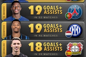 體育資訊11月10日訊 Score90統(tǒng)計了2025年五大聯(lián)賽后衛(wèi)在俱樂部+國家隊比賽中參與進球的數量,并列出榜單。
