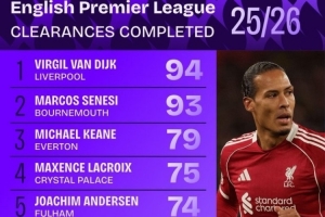 體育資訊11月11日訊 英超聯(lián)賽已經(jīng)進行了11輪,squakwa也統(tǒng)計了本賽季英超解圍次數(shù),范戴克力壓塞內西居首。