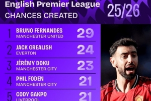 本賽季英超創(chuàng)造機(jī)會(huì)榜:B費(fèi)力壓格拉利什居首,曼城、利物浦各2人