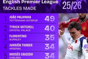 本賽季英超搶斷榜:帕利尼亞獨(dú)自領(lǐng)跑,廷伯、凱塞多在列