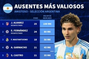 缺席本期阿根廷隊(duì)球員身價(jià)榜:小蜘蛛1億歐居首,恩佐8000萬(wàn)歐