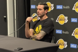 賽前湖人主帥雷迪克穿了一件定制的艾頓球衣出席了新聞發(fā)布會(huì),這件球衣正面是艾頓的臉和獅子的圖案拼接而成。