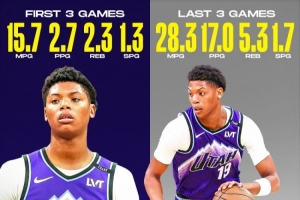 在他的生涯前三場比賽,他場均出場15.7分鐘,拿到2.7分2.3籃板1.3搶斷;而在最近三場比賽,他場均出場28.3分鐘,可以拿到17分5.3籃板1.7搶斷。