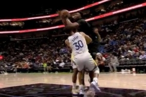 GIF-庫里頭上被肘到,但還是被改判防守犯規(guī)
