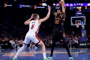 尼克斯新賽季至今8勝4負(fù),場(chǎng)均得分122.1分,場(chǎng)均失115.3分。上一場(chǎng)比賽,尼克斯主場(chǎng)140-132戰(zhàn)勝熱火,在布倫森缺席的情況下,阿努諾比首節(jié)就因?yàn)橥冉罾瓊聢?chǎng),替補(bǔ)狂砍75分是球隊(duì)獲勝最大的功臣。唐斯39分11籃板4助攻,沙梅特36分2籃板3助攻,約什·哈特12分12籃板10助攻,克拉克森24分5籃板3助攻,布里奇斯15分5籃板5助攻7搶斷。本賽季尼克斯僅出戰(zhàn)了3個(gè)客場(chǎng),球隊(duì)全部輸球。對(duì)陣熱火,內(nèi)線依然是尼克斯的優(yōu)勢(shì)所在,籃板球的爭(zhēng)搶、唐斯能否繼續(xù)暴走都可能影響到比賽勝負(fù)的走向。本場(chǎng)阿努諾比和布倫森缺席,麥克布萊德出戰(zhàn)成疑。