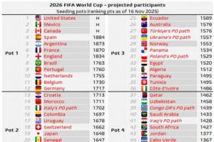 體育資訊11月17日訊 世預賽激戰(zhàn)正酣,目前世界杯48支參賽隊已確定32席,數(shù)據(jù)機構Football Meets Data根據(jù)現(xiàn)有世界排名給出了最新的世界杯分檔預測。